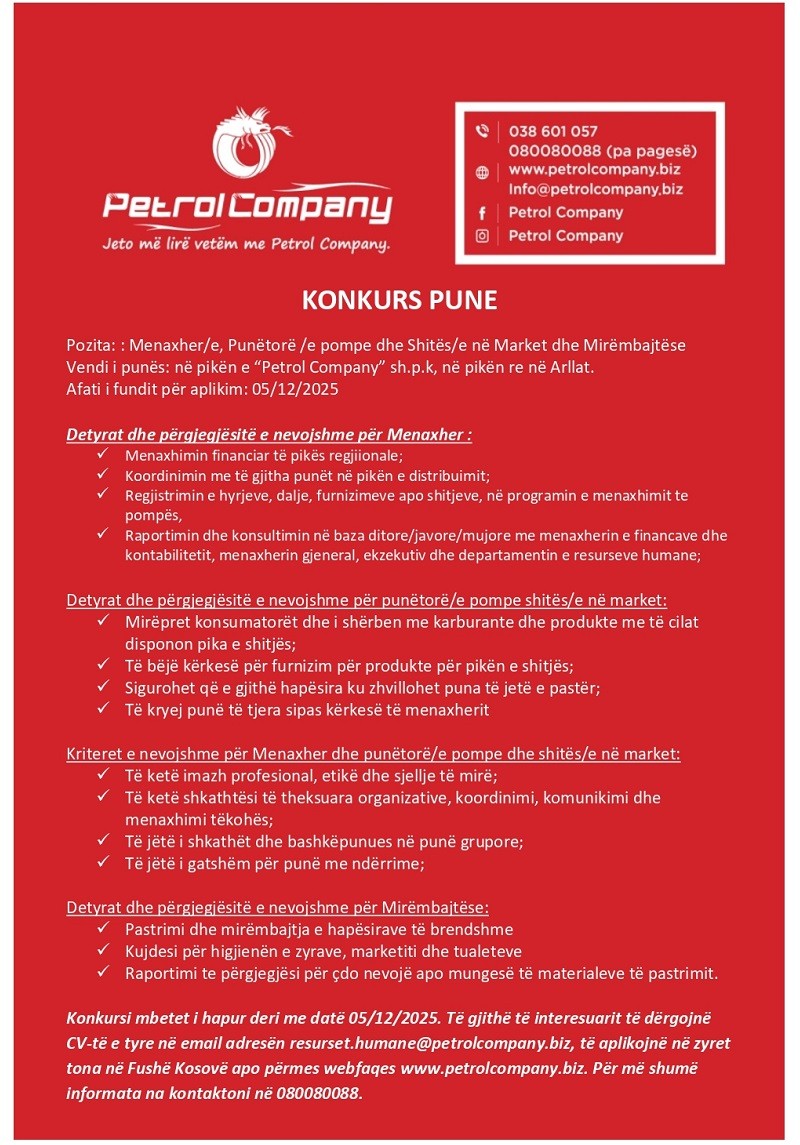 Menaxher/e, Punëtor/e pompe, Shitës/e në Market, Mirëmbajtëse