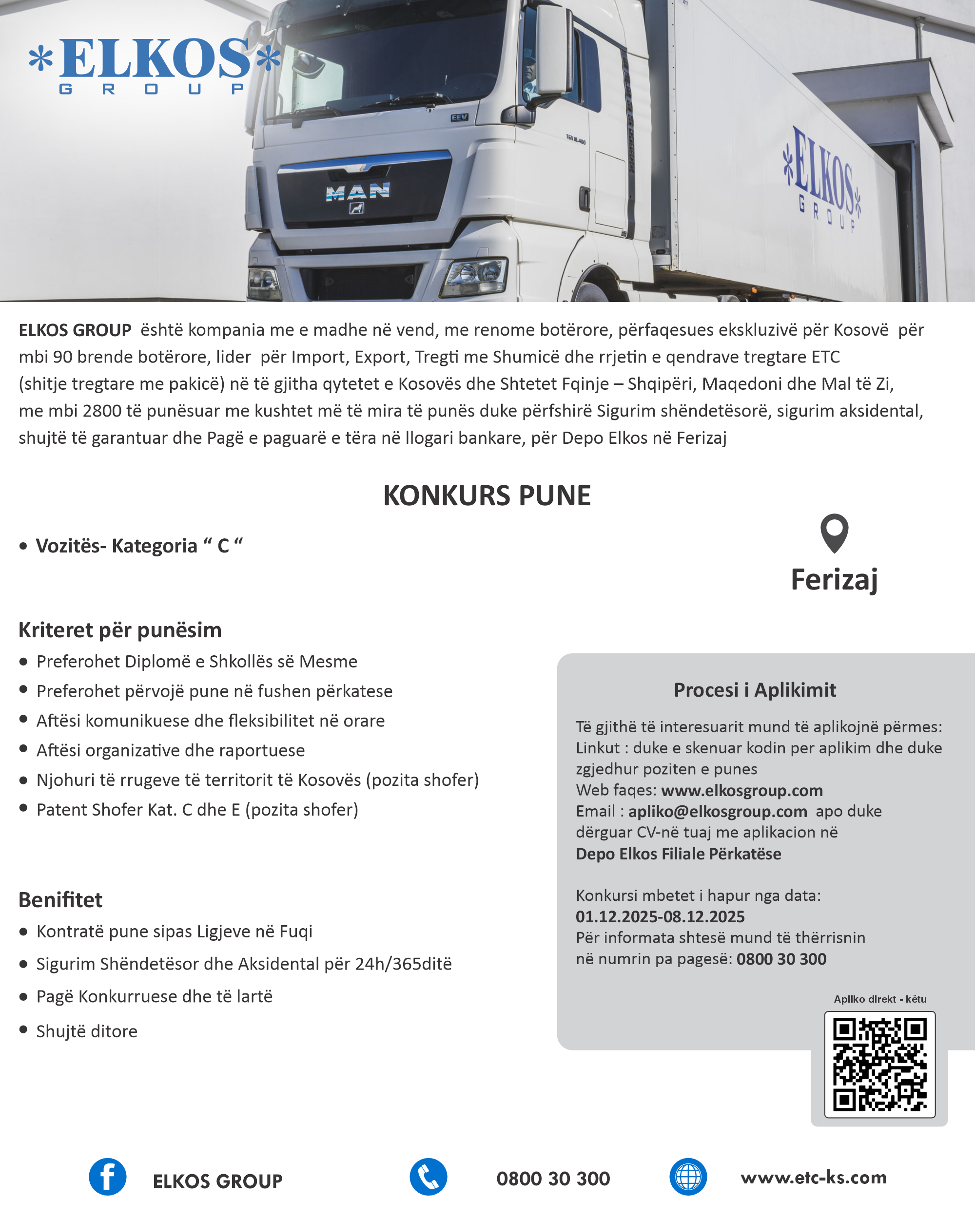 Shitës ambulantiv (2), Shofer kamioni - kategoria C (3), Supervajzer (2), Ndihmes depoist (2)
