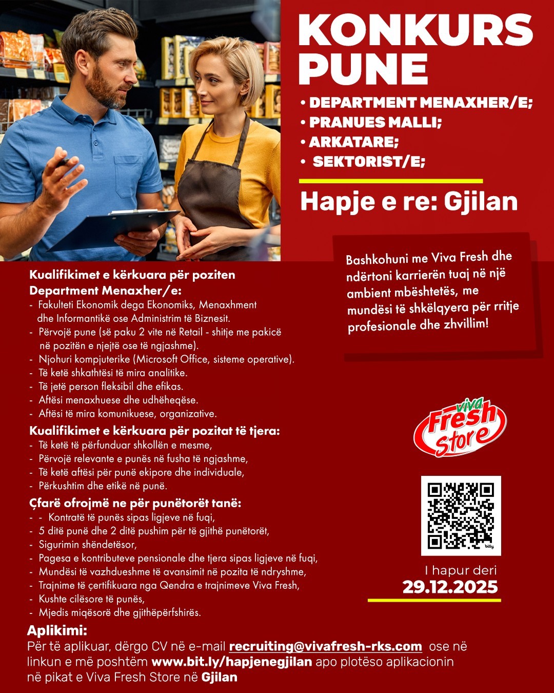 Linku per aplikim: https://vivafresh-rks.com/aplikimet/hapje-e-re-gjilan/