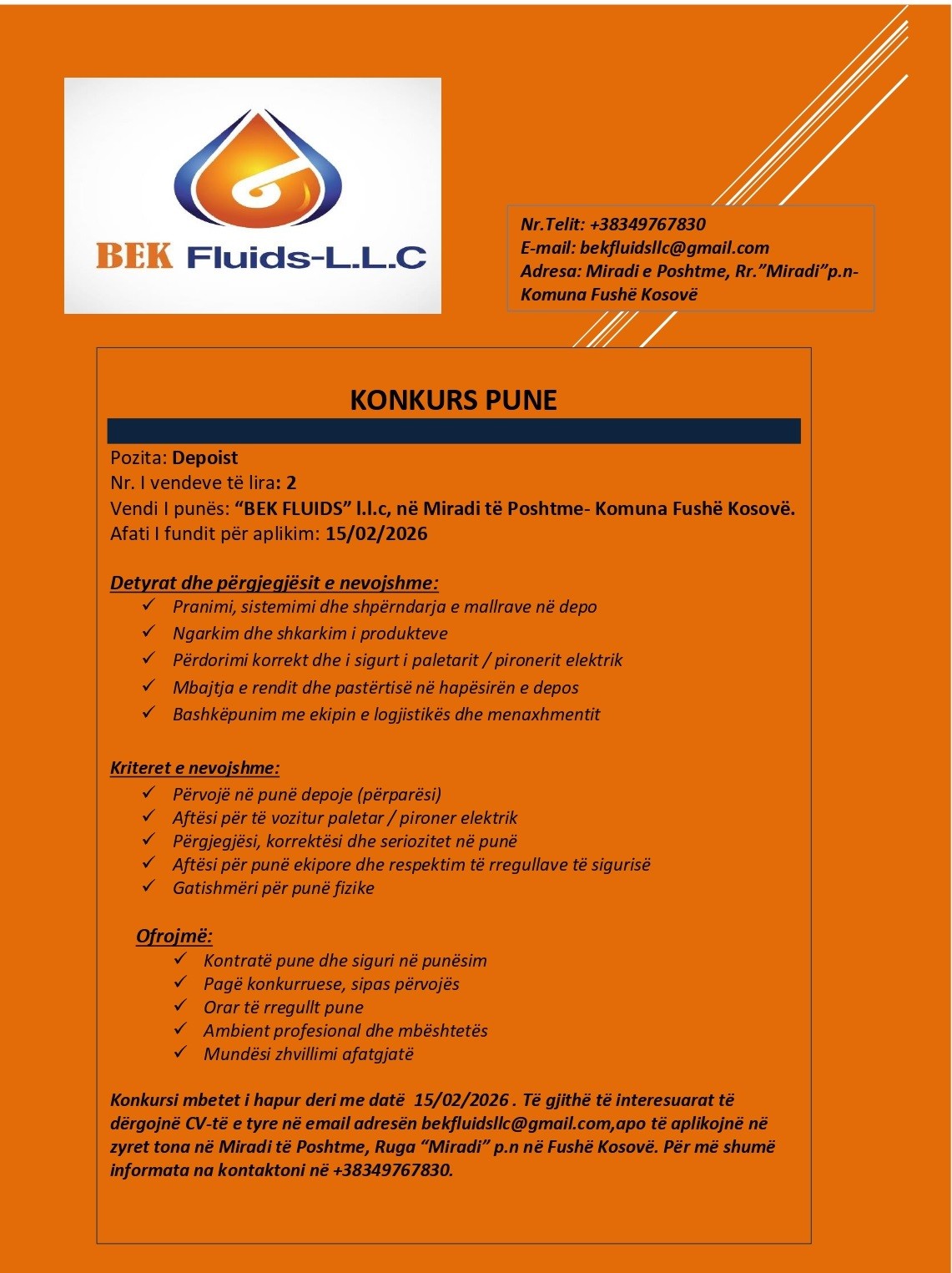Menaxher i Distribucionit, Agjent Shitjeje në Terren, Shofer për Distribucion, Depoist / Magacioner, Administratë dhe Faturim