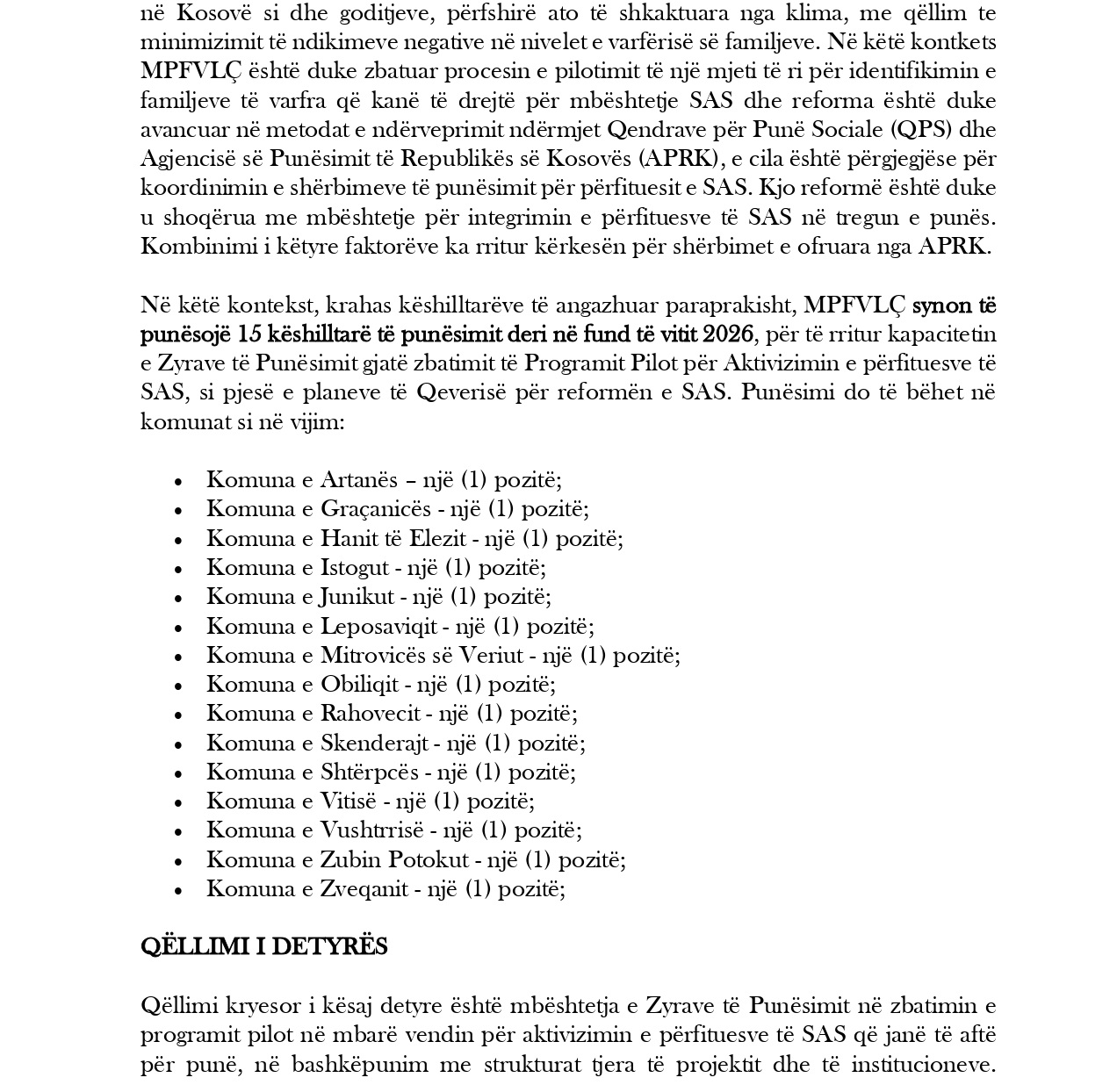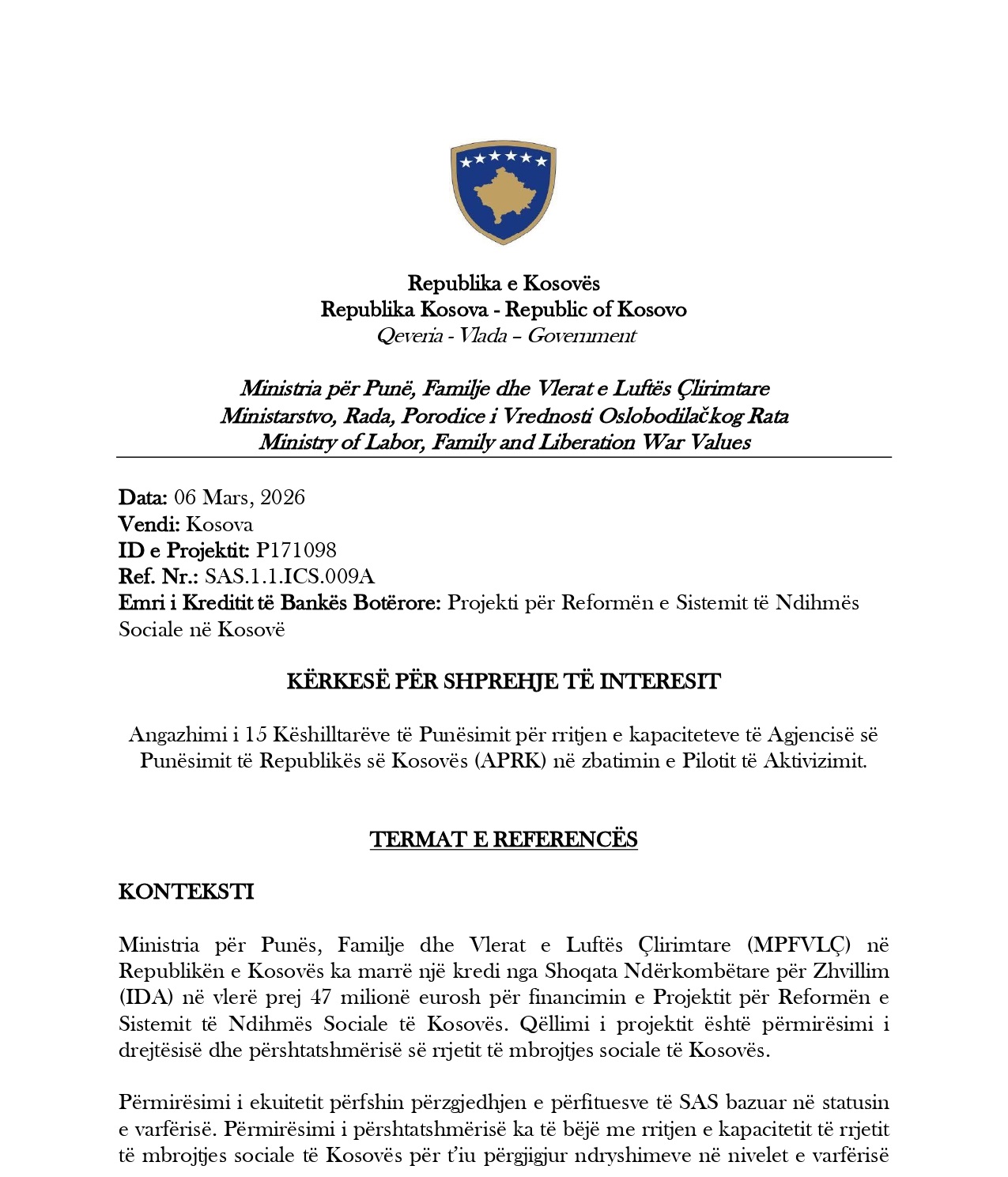 Projekti për Reformën e Sistemit të Asistencës Sociale në Kosovë (SAS) Njësia Koordinuese e Projektit – NKP