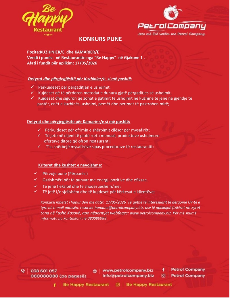 Hostesë (vajzë), Shankist/e (2), Kamarier/e, Ndihmës/e Kuzhine, Picamen